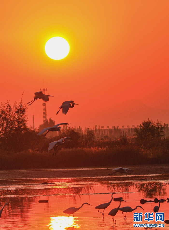 近日,在甘肅省張掖國(guó)家濕地公園,成群的白鷺迎著朝陽(yáng)悠然自得地飛翔、覓食、嬉戲,構(gòu)成了一幅朝陽(yáng)伴鷺飛的美麗畫(huà)卷。新華網(wǎng)發(fā)(陳禮 攝)