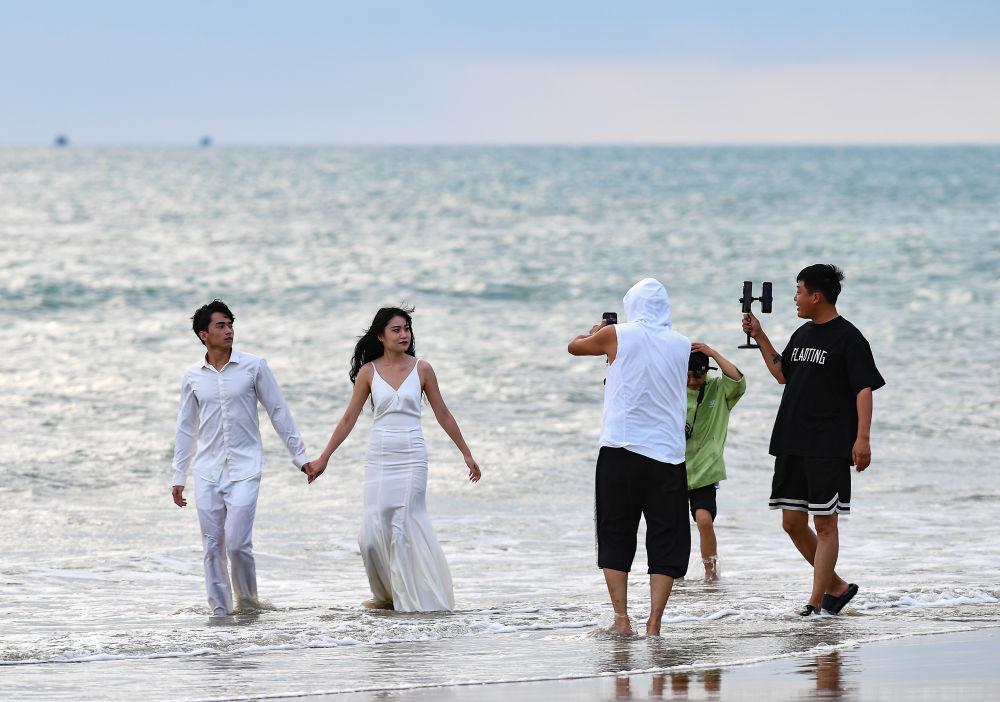 ↑2023年12月19日,一對(duì)情侶在三亞“椰夢長廊”海濱風(fēng)景大道拍照留念,新華社記者 樊雨晴 攝