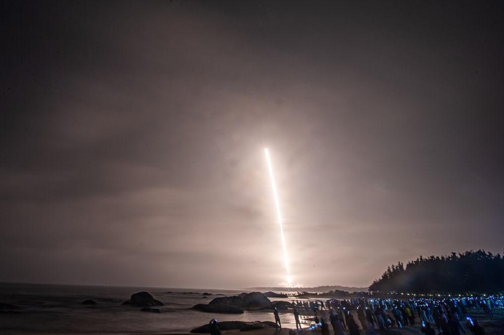 ↑長征七號(hào)改遙二運(yùn)載火箭在海南文昌航天發(fā)射場發(fā)射,吸引眾多居民和游客在海邊觀看。新華社記者 蒲曉旭 攝