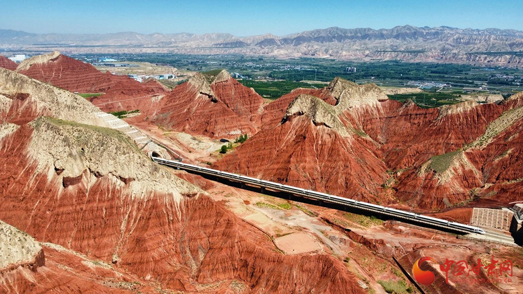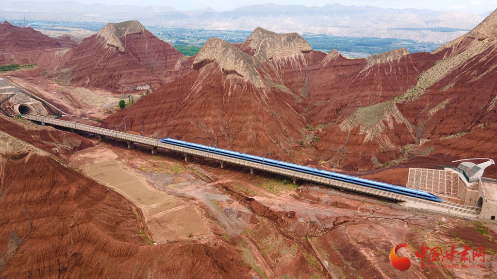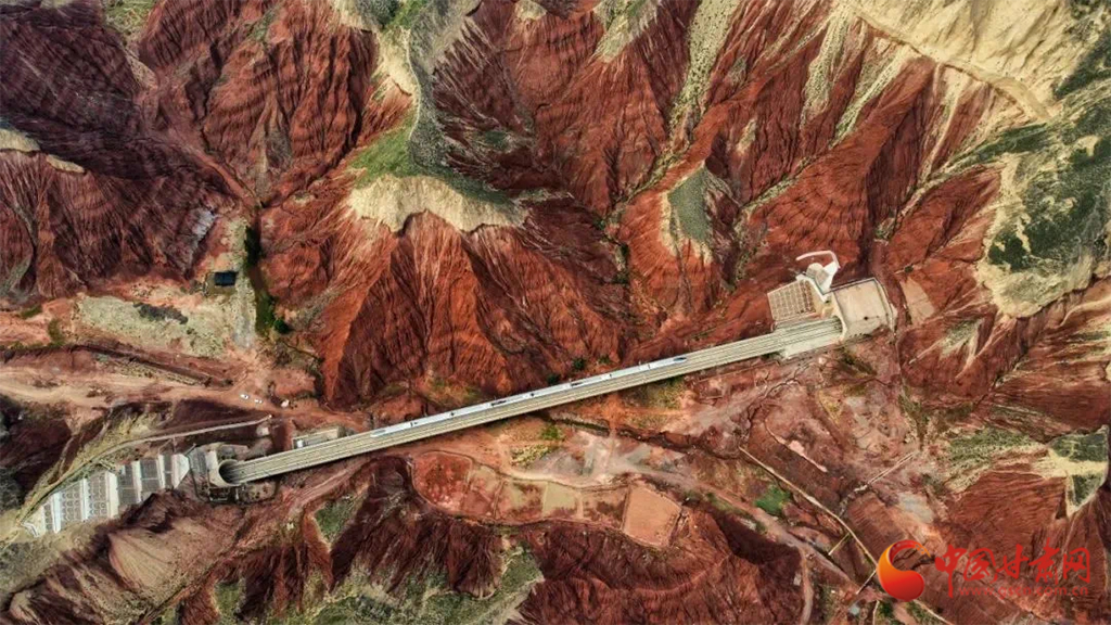 朝家山隧道位于蘭州市紅古區(qū)和青海省民和縣交界處,是蘭新高鐵西出蘭州必經(jīng)之地。在這里,通體呈紅色的丹霞地貌在湛藍(lán)天空下越發(fā)顯得艷麗奪目,列車穿越七彩丹霞,風(fēng)景如畫風(fēng)光無(wú)限好。