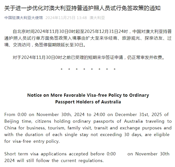 據(jù)“中國駐澳大利亞大使館”微信公眾號(hào)消息,自北京時(shí)間2024年11月30日0時(shí)起至2025年12月31日24時(shí),中國對(duì)澳大利亞持普通護(hù)照人員試行單方面免簽政策入境事由擴(kuò)大至來華經(jīng)商、旅游觀光、探親訪友、過境、交流訪問,免簽停留期限延長至30日。