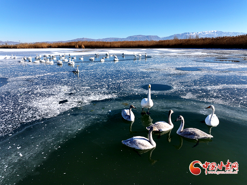 近日,在甘肅省張掖國(guó)家濕地公園,成群的越冬天鵝在冰封的湖面上悠然覓食、嬉戲,構(gòu)成了一幅動(dòng)人的生態(tài)畫卷,成為冬日里一道尤為引人注目的風(fēng)景線。