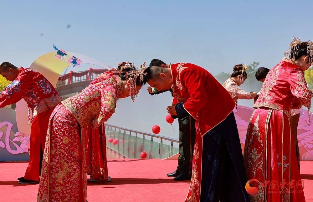 活動(dòng)現(xiàn)場(chǎng),古色古香的布置與悠揚(yáng)婉轉(zhuǎn)的禮樂(lè)相得益彰。參加集體婚禮的新郎、新娘走過(guò)連心橋,共同牽繡球入場(chǎng),舉行拜天地、行合巹禮等傳統(tǒng)儀式,一揖一禮間盡顯中式婚禮的莊重典雅與浪漫情懷,每一個(gè)環(huán)節(jié)都飽含著對(duì)新人的美好祝福。