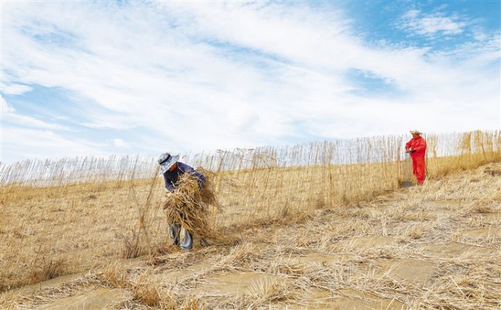 近日,在金塔縣黑河中游防沙治沙林草綜合治理項(xiàng)目固沙現(xiàn)場,工人在起伏的沙丘上或鋪設(shè)草方格沙障,或搭建高立式沙障,努力為沙漠邊緣的綠洲、城市筑起屏障。