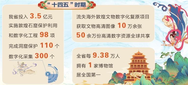 在文物保護提質(zhì)升級方面,我省投入3.5億元,實施敦煌石窟保護利用和數(shù)字化工程98項,完成洞窟保護110個、數(shù)字化采集300個,建成全球首個文物保護多場耦合實驗室,制定國家和行業(yè)標準27項,科研成果服務16省市及部分共建“一帶一路”國家;流失海外敦煌文物數(shù)字化復原項目獲取文物高清圖像10萬余張,50余萬份高清數(shù)字資源全球共享;第四次全國文物普查新發(fā)現(xiàn)線索4659條,投入24.26億元實施900余項重要文保項目;打造河西走廊國家遺產(chǎn)線路,創(chuàng)建嘉峪關(guān)長城國家文物保護利用示范區(qū),全省文物系統(tǒng)性保護成效顯著,“中國特色?敦煌經(jīng)驗”國際影響力持續(xù)提升。