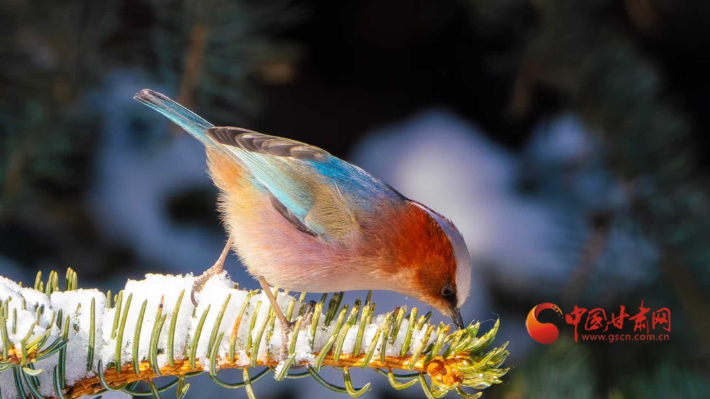 中國甘肅網(wǎng)2月26日訊(西北角·中國甘肅網(wǎng)記者 張慧雅 通訊員 焦方寧 王東琳 張宏)春日里,朔風(fēng)卷寒,瓊英漫舞。冷空氣過境后,祁連山區(qū)被厚厚的白雪層層疊疊地包裹,千峰萬壑在陽光下閃耀著清冷的銀輝,仿佛天地間所有的色彩都被收斂,只留下一片浩渺蒼茫的純白世界。暖陽下的祁連山林靜極了,靜得能聽見雪粒從松針上輕輕滑落的細(xì)碎聲響。在清寂蒼莽的林海間,總有一抹靈動色彩暈染在蒼山翠柏之間,為寒冷的山野添得幾分鮮活生氣。這抹亮色,定格了鳳頭雀鶯雪中覓食的珍貴瞬間。這些幀幀如畫的影像,既鐫刻下高山珍禽于自然環(huán)境中求生的智慧,也繪就出祁連山生態(tài)系統(tǒng)獨(dú)有的生命力與堅(jiān)韌底色。