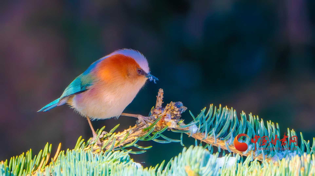 海拔3000米上下的針葉林帶,松枝凝霜,雪色如素,構(gòu)成一幅清寂的春日長卷。而體長僅約10厘米的鳳頭雀鶯,恰似畫卷中潑灑的靚麗色彩。