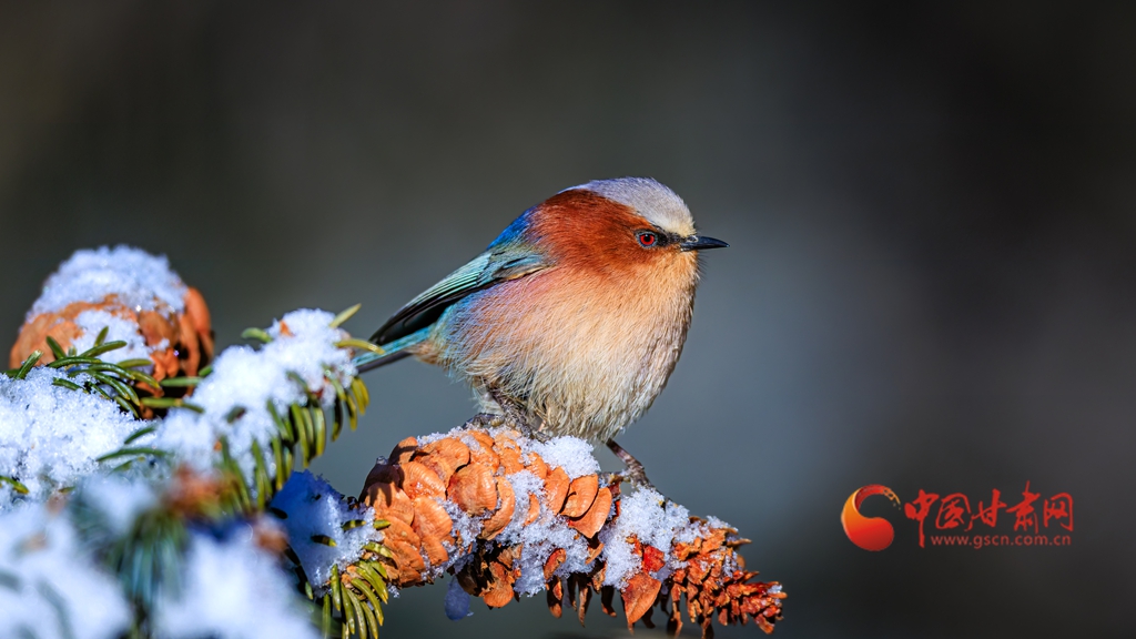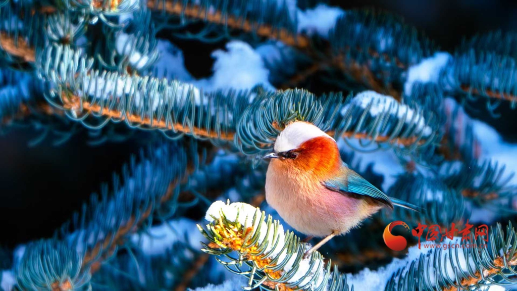 這群被譽(yù)為“祁連山精靈”的小鳥,頭頂雪白羽冠蓬松如絨,仿佛戴上了一頂天然的小絨帽,棕紅面頰溫潤似玉,在陽光下泛著柔和的光澤,藍(lán)綠背羽如同上好的寶石,在雪色映襯下泛著金屬般的質(zhì)感。淡粉與橙白相間的腹羽柔和雅致,層次分明,在純白背景的映襯下,形成強(qiáng)烈而和諧的視覺碰撞,它們或亭亭立于覆雪松枝,或靈巧穿梭于松針間隙,更有靈動的個體俯身探喙,啄取松針縫隙里的昆蟲,一聲輕脆的啄擊,劃破林間的清寂,卻更顯山野幽靜,羽翼輕振間,將“雪中覓食”的鮮活圖景永久定格。